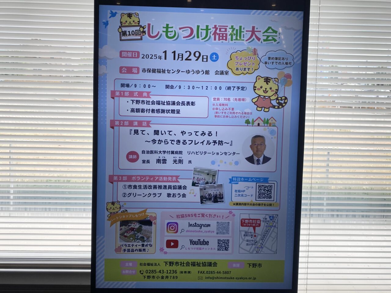 2025年11月29日(土)に「第10回しもつけ福祉大会」が開催されます。場所は下野市保健福祉センターゆうゆう館の会議室。【開場】9:00〜【開会】9:30〜12:00(終了予定) 【定員】70名(先着順) ※入場無料、申し込み不要(車いすを利用される場合は事前にお申し込みください)【第一部】式典 社協会長表彰及び感謝状の贈呈【第二部】講話 題目『見て、聞いて、やってみる!~今からできるフレイル予防~』講師:自治医科大学付属病院リハビリテーションセンター 室長 南雲光則氏【第三部】ボランティア活動発表・市食生活改善推進員協議会・グリーンクラブ 歌おう会【その他】ハートショップしもつけの販売来場者へちょっぴりお楽しみプレゼントがあるようです♪興味がある方は足を運んでみてはいかがでしょうか。