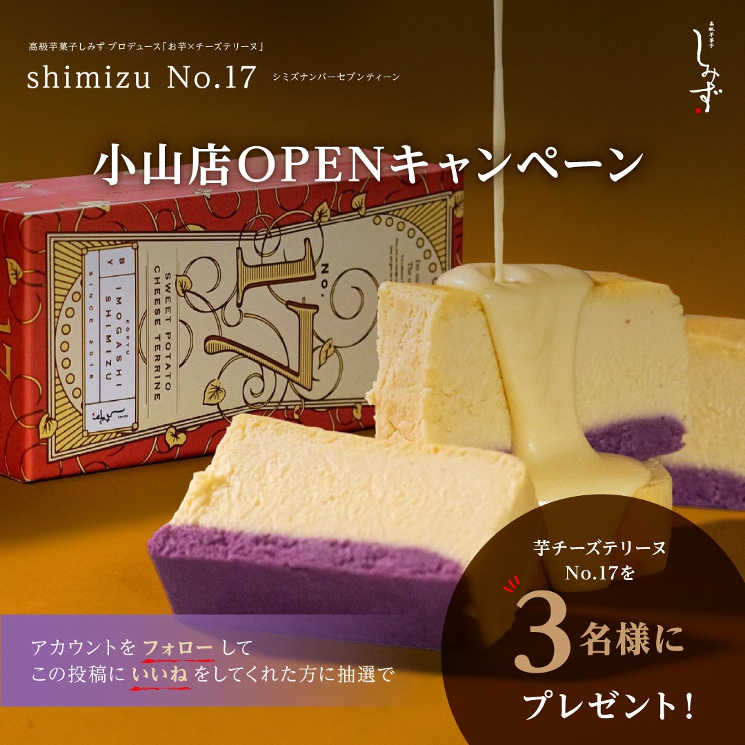 「高級芋菓子しみず栃木Instagram」のアカウントをフォローし、当画面の投稿にいいねをした方の中から抽選で3名様に、「shimizu No.17のお芋チーズテリーヌ」をプレゼントされるようです!